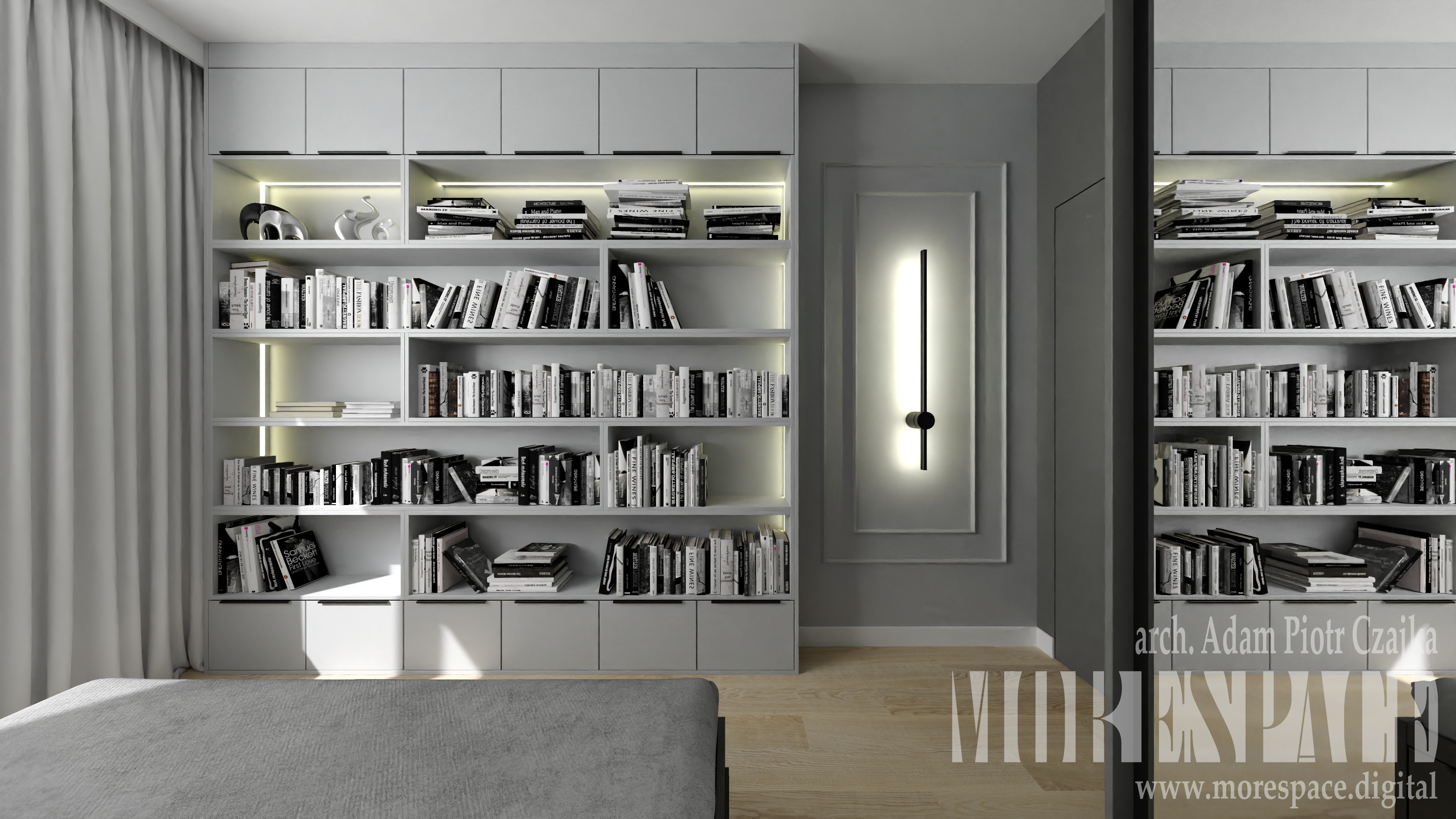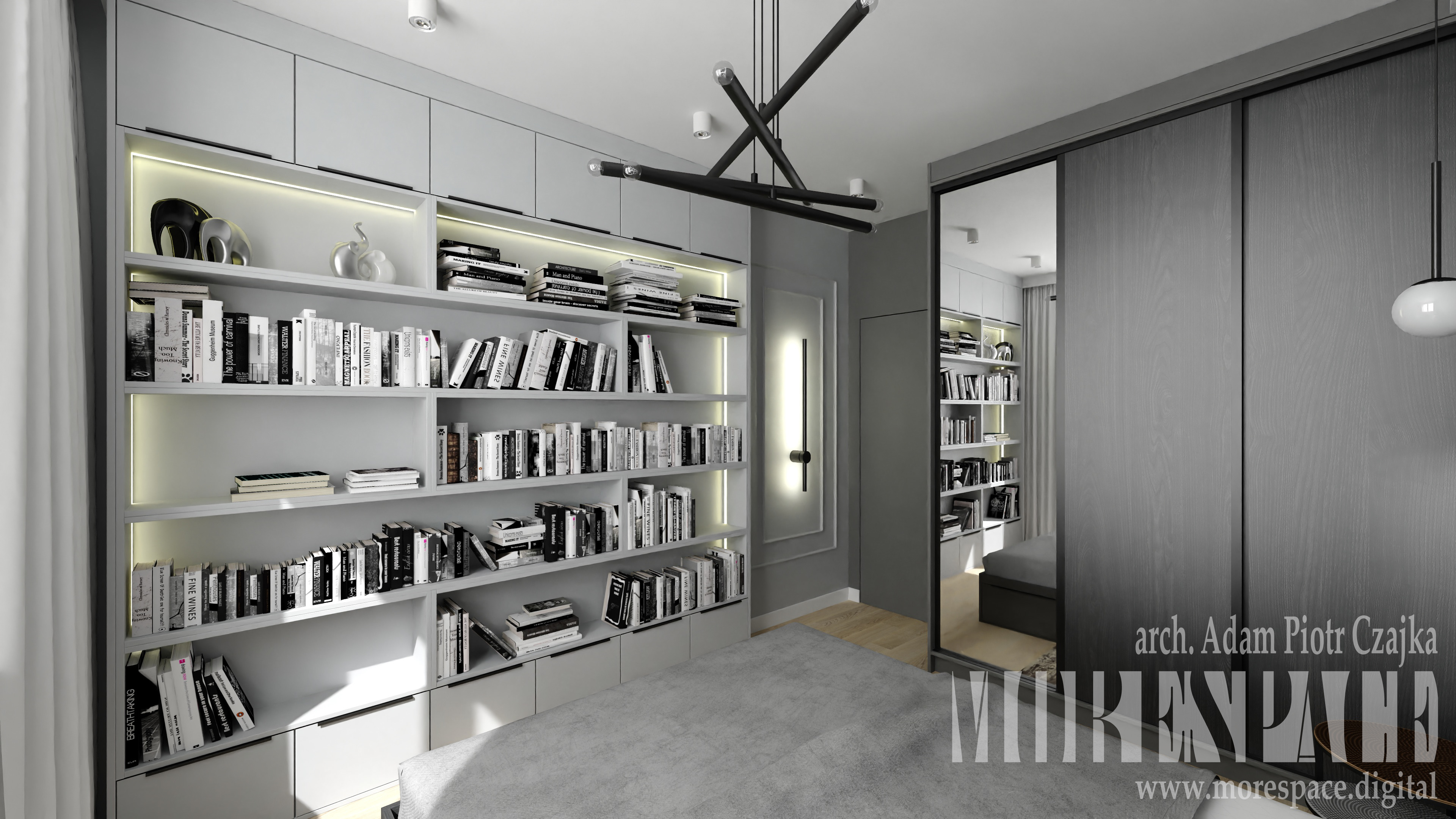 SZARA SYPIALNIA Z BIBLIOTECZKĄ